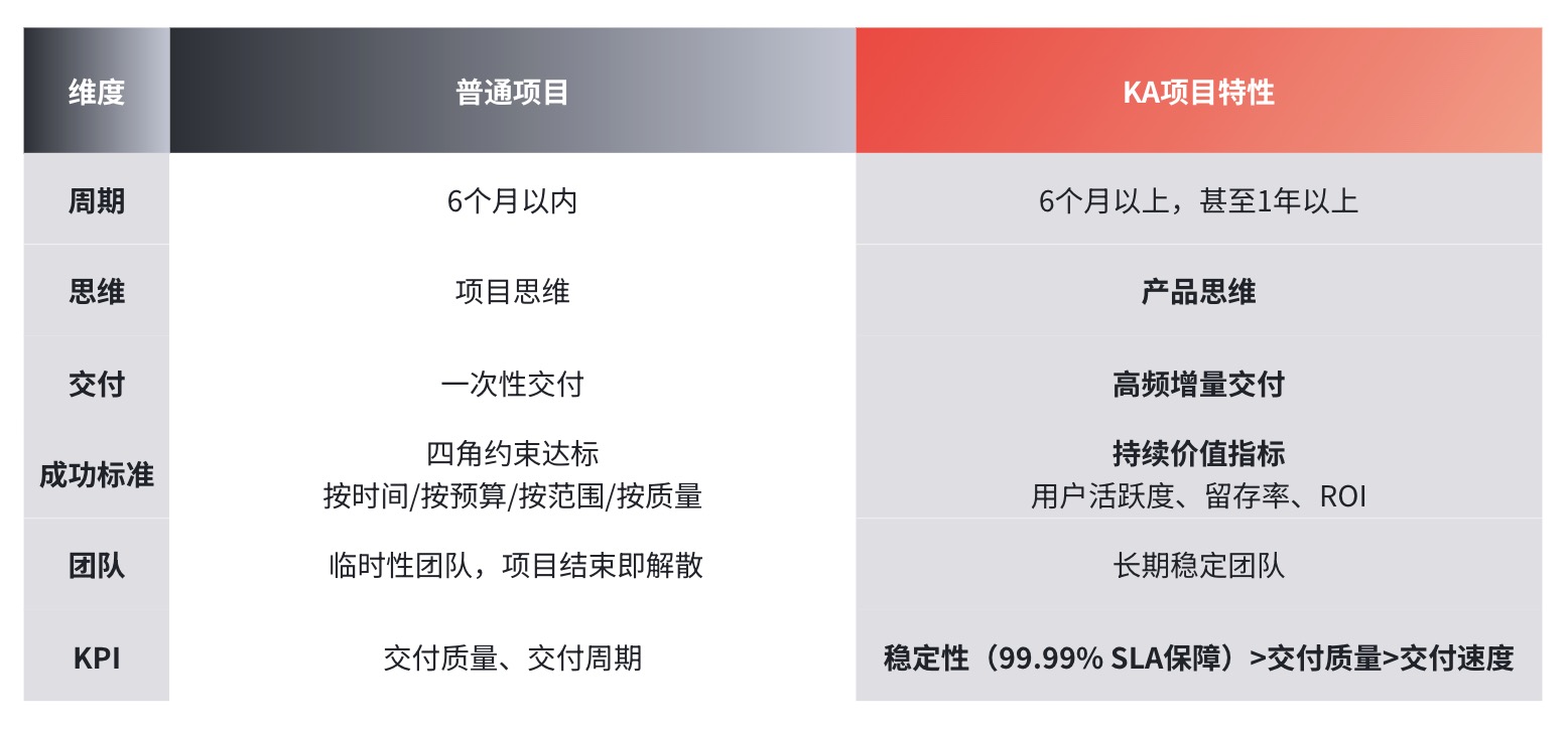 而KA项目周期较长,强调产品思维和高频增量交付,成功标准则更注重持续的价值输出,如用户活跃度和投入产出比。